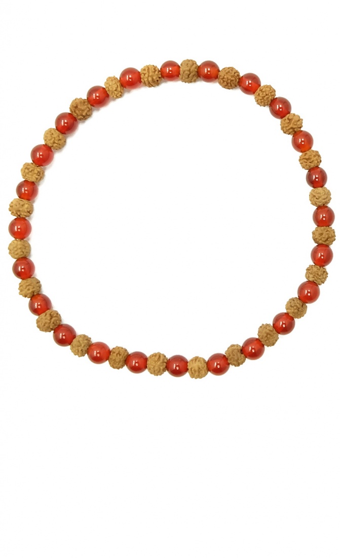 A petite bracelet full of optimism and joy with it's red carnelian stones in combination with the light rudrani and silver bead in the middle.