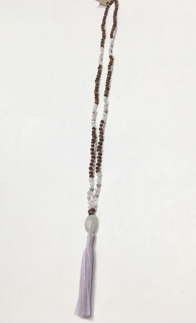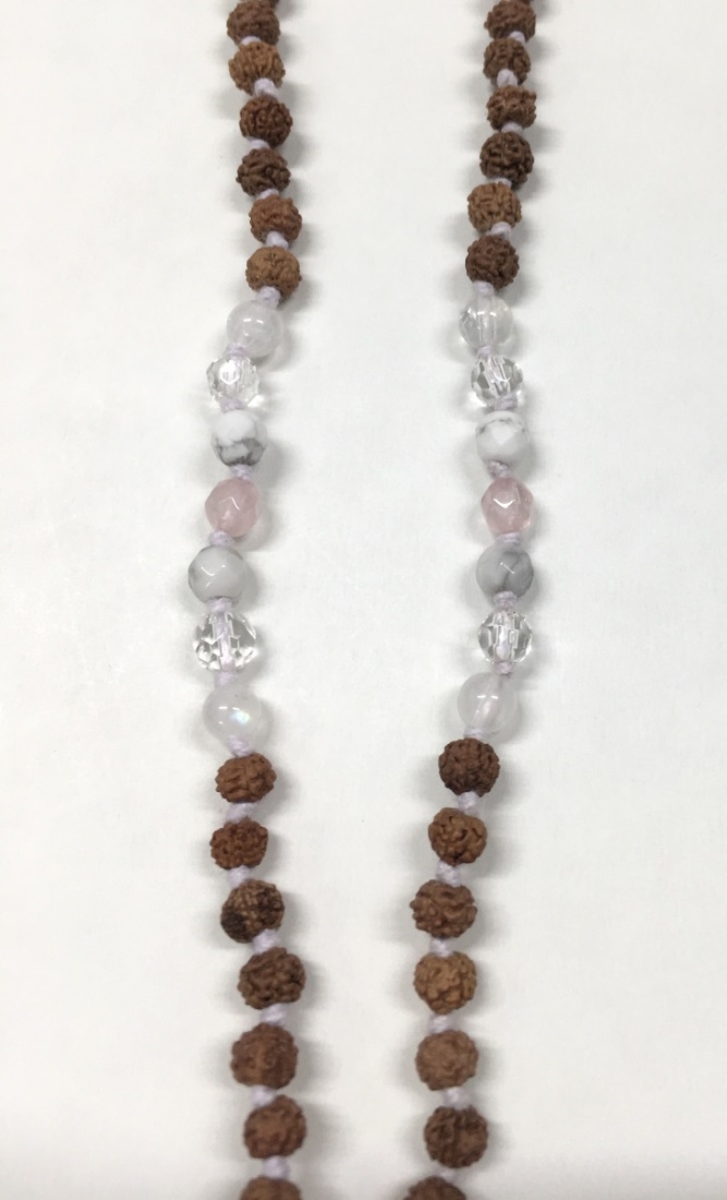 Hand knotted Mala in soft hues made of exclusive 3mm Rudraksha beads paired with: